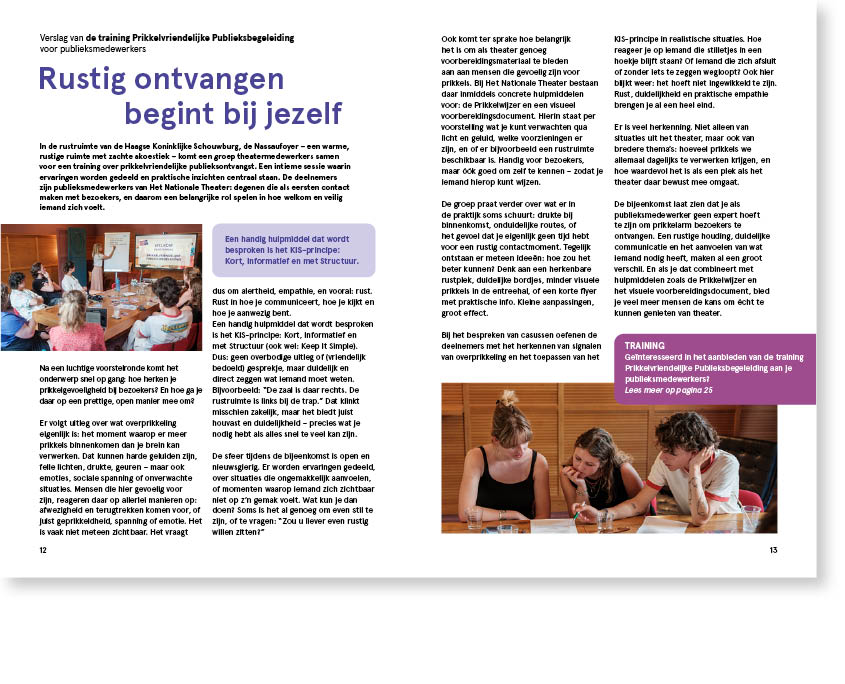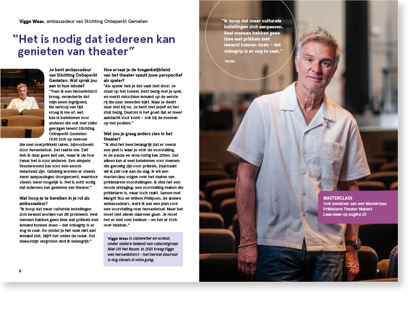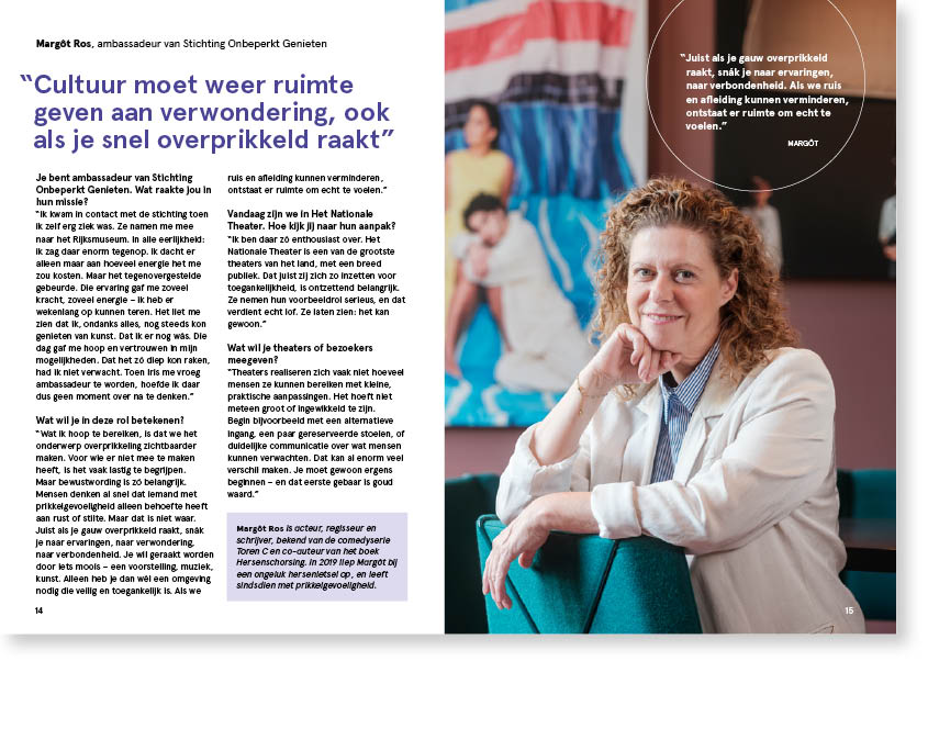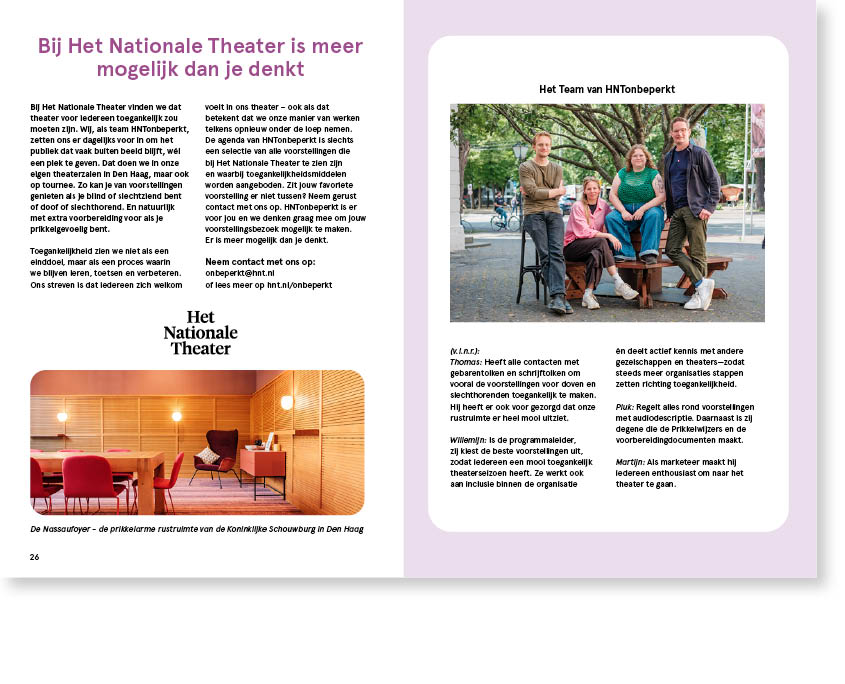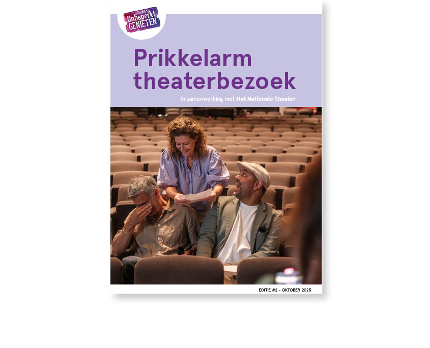 Voor Het Nationale Theater Den Haag en de stichting Onbeperkt Genieten heb ik een brochure vormgegeven. Een magazine over prikkelarm theaterbezoek, vol ervaringsverhalen, informatie en tips. Hierin kunnen mensen lezen wat het theater heeft bewerkstelligd voor mensen die slechtziend, slechthorend, slecht ter been of prikkelgevoelig zijn.